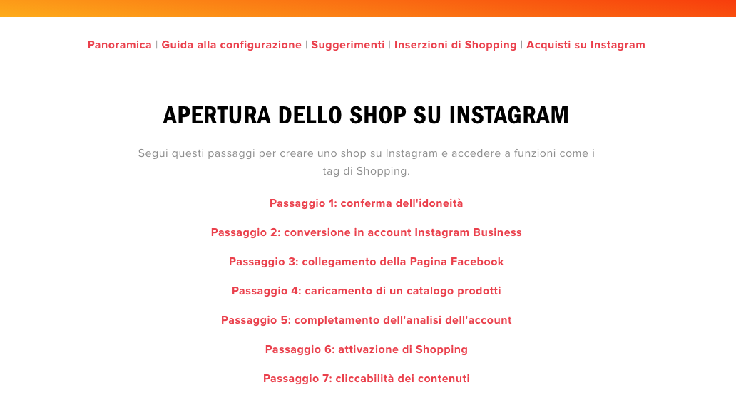 Questa parte è ancora in lingua inglese, segno che il sito si sta evolvendo giorno dopo giorno, ma anche in questo status possiamo cogliere numerose risorse interessanti, a cominciare dalla tanto agognata configurazione della modalità shopping su Instagram. Fino a qualche tempo fa infatti le guide per l’attivazione erano molto rare e articolate; ora abbiamo modo di seguire i piccoli passi illustrati nel sito.
